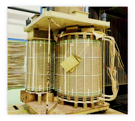 变压器器身采用公司首创的“8”字线圈整体组装工艺,严格控制各绕组见的装配裕度,使组装后的所有线圈的电抗中心在同一水平线上,以确保达到设计要求的安匝不平衡程度,并保证各绕组之间的紧实度,确保线圈不松动。